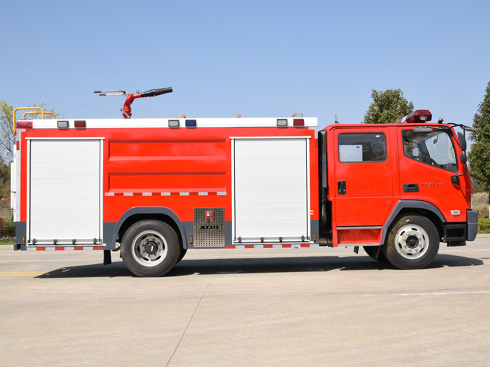 消防泵在箱体中间或者后置,泵房左右两侧4个出水口、器材箱左右后侧均有新款易拉高强度铝合金卷帘门。